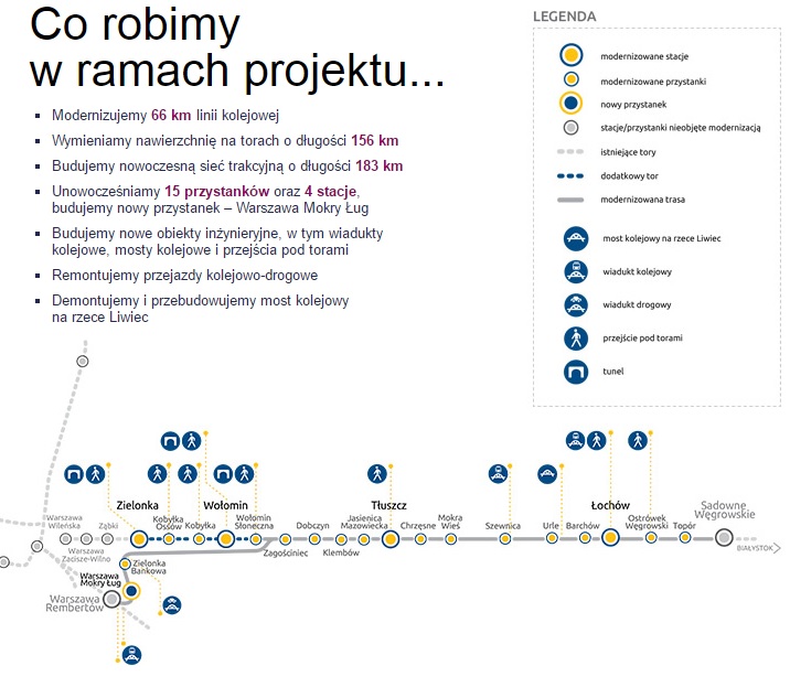Inwestycje realizowane są w ramach modernizacji linii E75 Warszawa – Białystok. Modernizacja tej trasy to aktualnie jedna z najważniejszych inwestycji na polskich torach, której efektem będą szybsze i wygodniejsze podróże ze stolicy do Białegostoku. Wzrośnie także poziom bezpieczeństwa, dzięki przebudowie przejazdów kolejowo - drogowych i budowie bezkolizyjnych skrzyżowań.